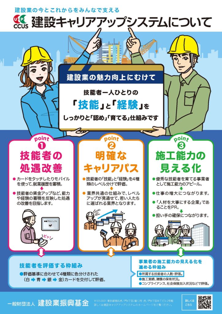 建設キャリアアップシステム(CCUS)は、建設業に従事する技能者の就業履歴や資格情報を一元的にデータベースに登録・蓄積し、その技能や経験を可視化し公正に評価することで、技能者の処遇改善やキャリア形成を促進することを目的とする国の制度です。