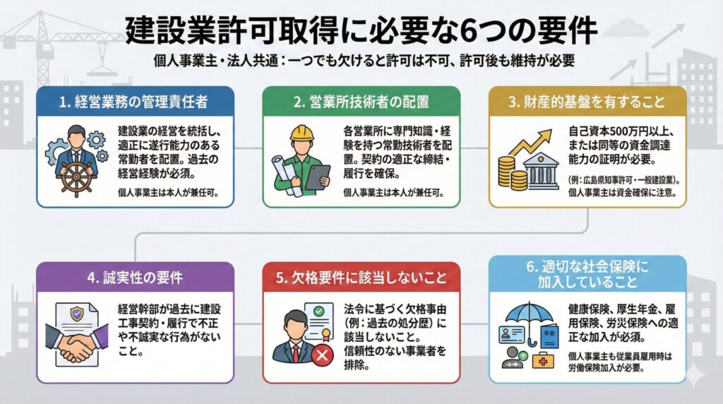 個人事業主の場合でも、法人の場合でも、建設業許可を取得するためには、次の6つの要件を満たすことが必要です。一つでも欠けると許可は認められず、許可後に要件を失えば取消処分を受ける場合もあります。