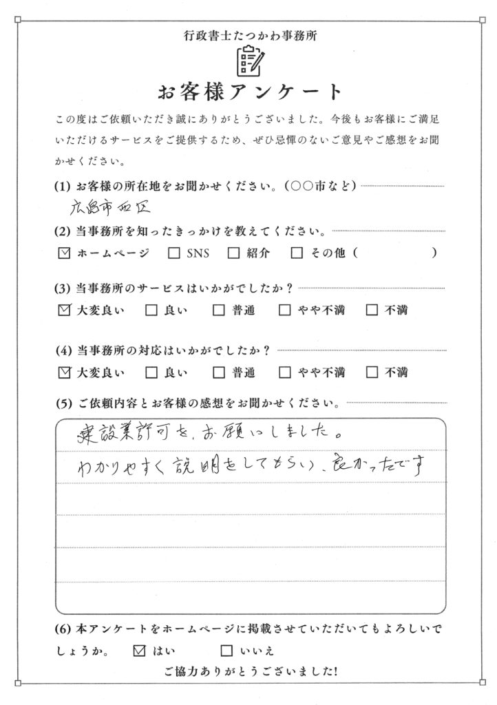 申請受理後は特に補正も無く、無事に許可を取得することができ、大変嬉しく思います。この度は、弊所にご依頼をいただき、誠に有難うございました。今後ともどうぞ宜しくお願いいたします!